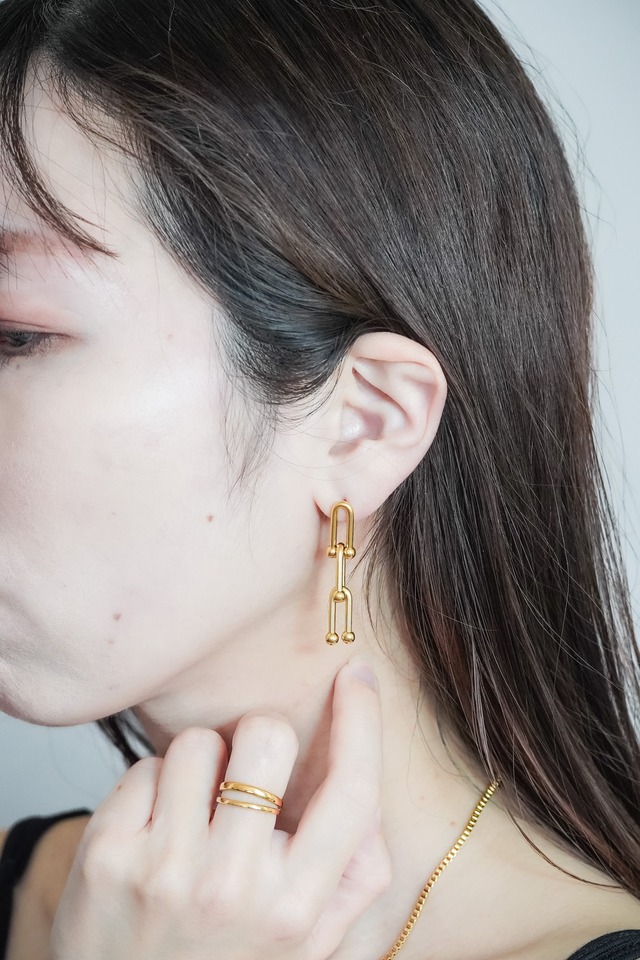 アルファベットのUをモチーフにした存在感のあるピアスです。 Uモチーフを3つ繋ぎ合わせたボリュームのあるデザインが魅力的です。 その洗練された印象は、ファッションにアクセントを加えるだけでなく、あなたのスタイルに個性と力強さをプラスします。 日常的にも特別な日のコーディネートにもお勧めのピアスです。 金属アレルギー対応のサージカルステンレス製で、錆びや変色にも強くお手入れも簡単。 医療用にも使用される信頼性の高さで、金属アレルギーの方でおしゃれを楽しみたい方にも安心の素材です。 ※すべての方にアレルギー反応が起きないことをお約束するものではありません。 アレルギー反応が出た場合は使用をお控えいただくようお願いいたします。 ※錆に強く、変色しづらい特徴の素材ですが、経年劣化などにより、永久に製品状態を保証するものではございません。使用状況・方法などによって劣化の速度は異なります。 ※両耳セットアイテムです 素材:サージカルステンレス