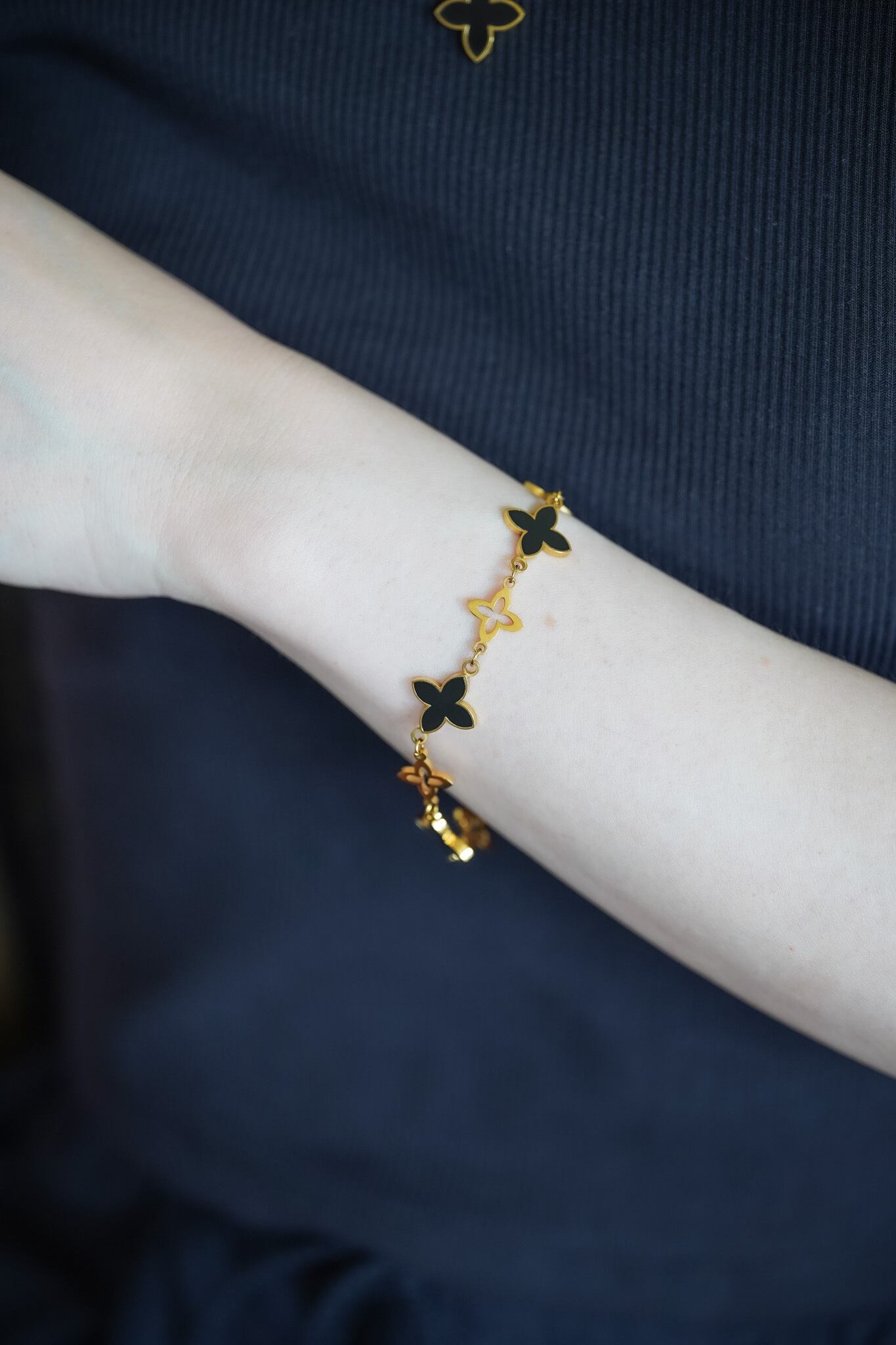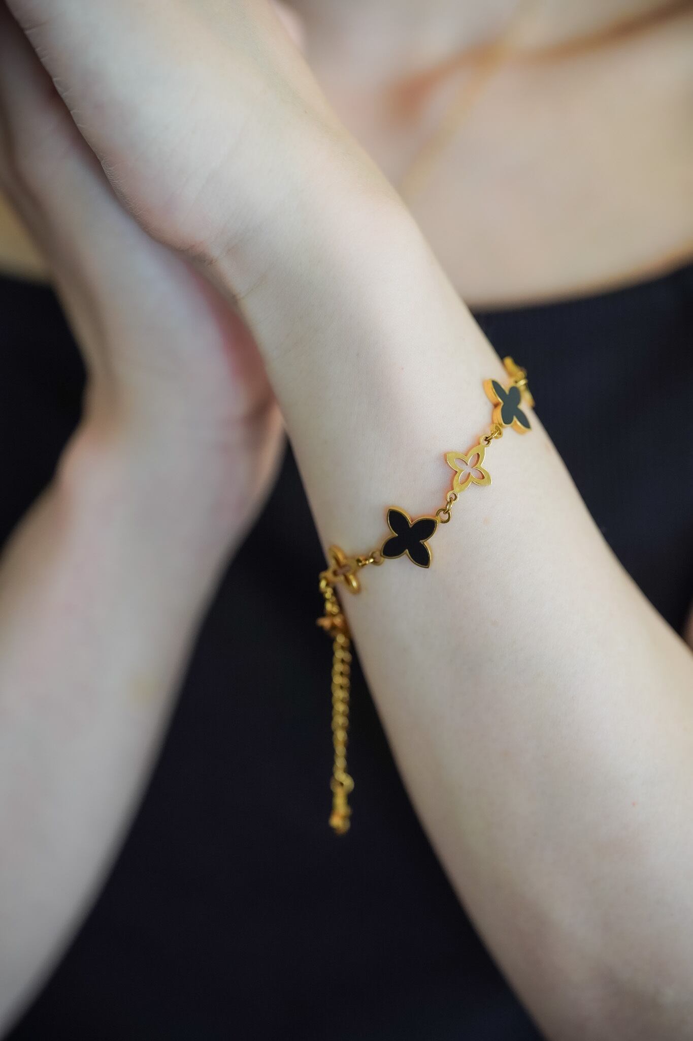 ブラックシェルとくり抜かれた2つのフラワーが交互に配置された華やかなブレスレットです。