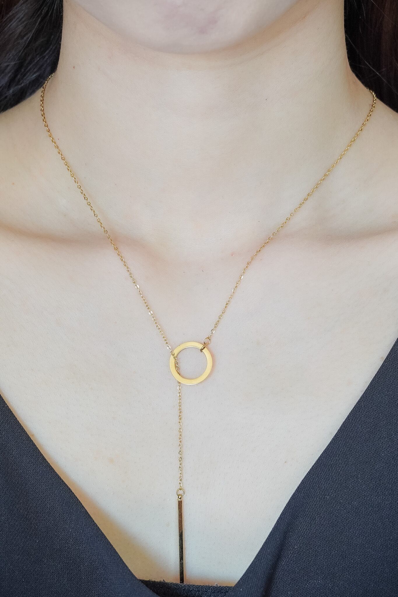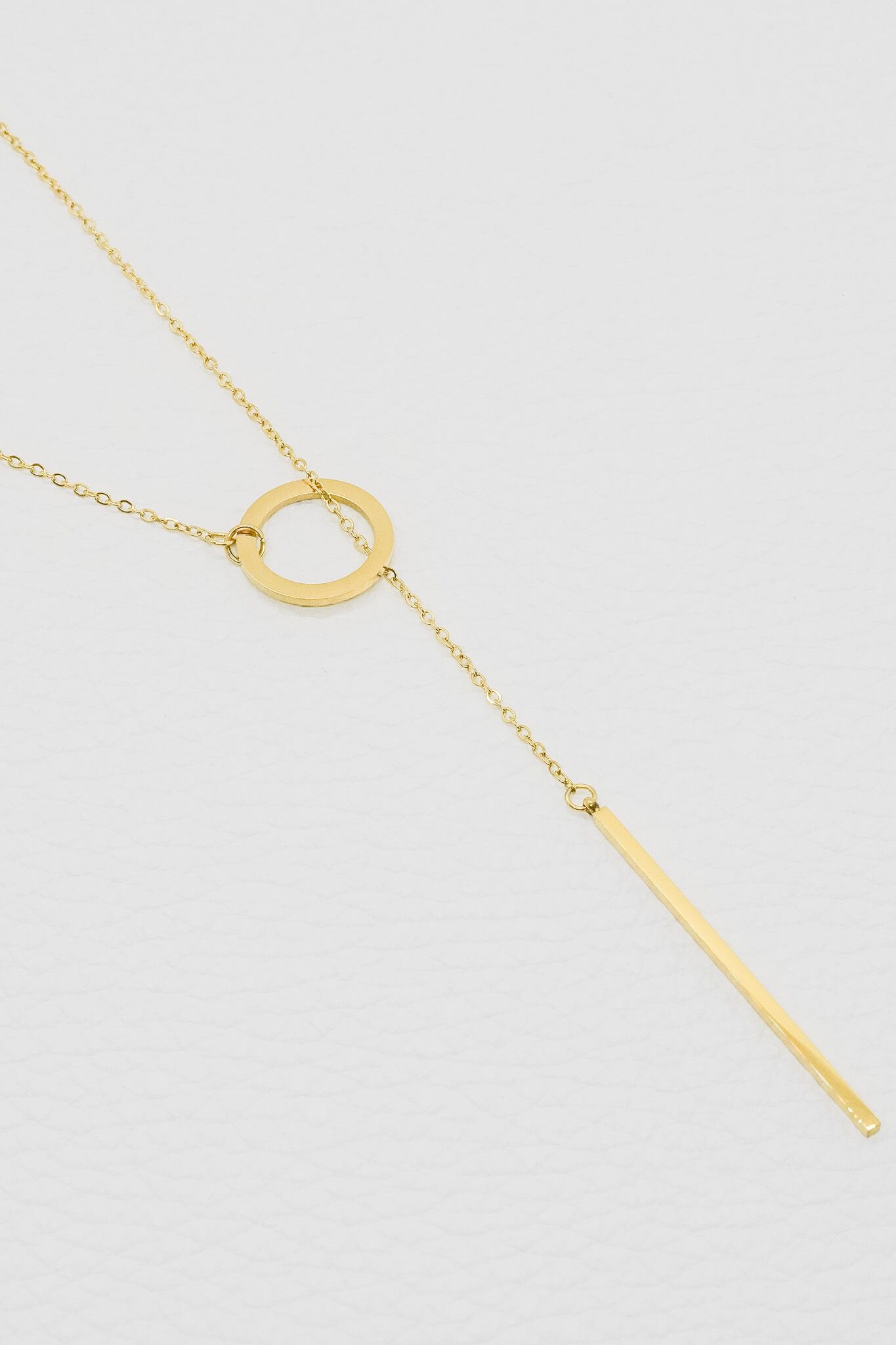 留め具が無く、サークルモチーフにスティックモチーフの先端を通すタイプのエレガントなデザインのネックレス。
